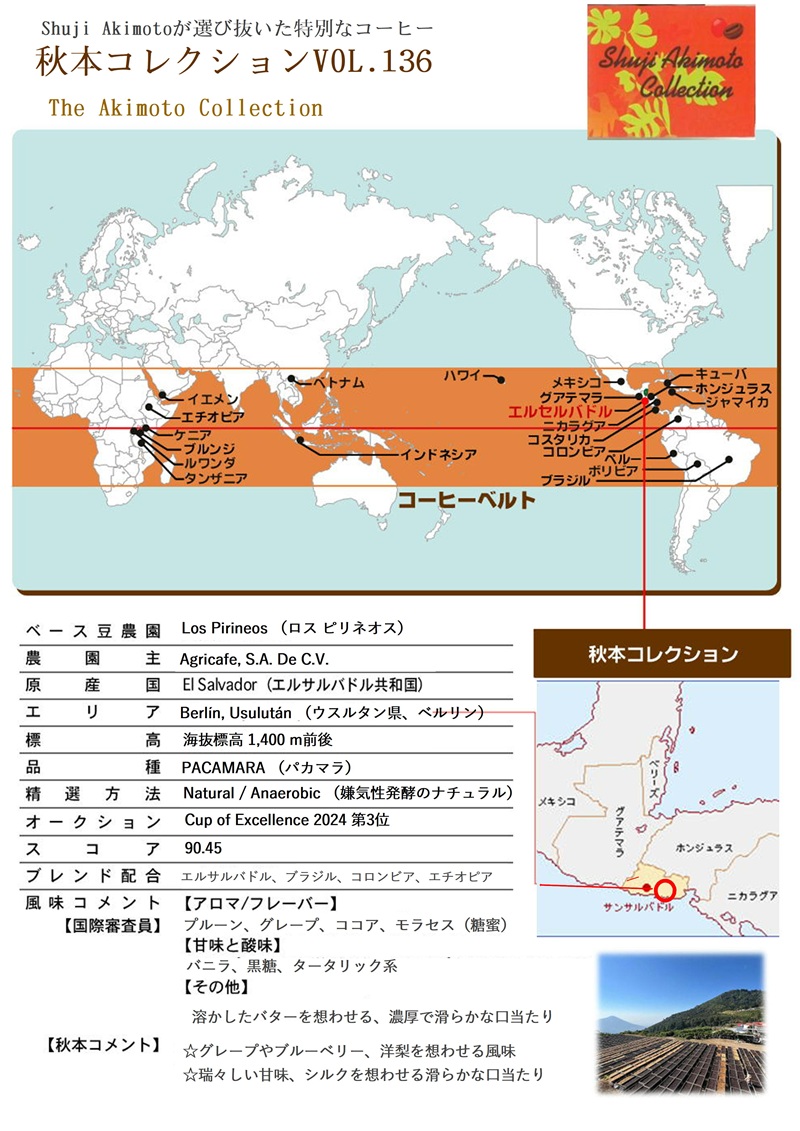 秋本コレクションはCOE(Cup of Excellence)入賞ロットや、優れたクオリティのスペシャルティコーヒーをベースに使用した、極上のブレンドコーヒーです。ファディのトップ 『Shuji Akimoto』 が厳選した最上級のコーヒーを皆様にお届けします。 中米エルサルバドルの COE 2024で3位にノミネートした、「ロス・ピリネオス(Los Pirineos)」。 130年以上にわたりコーヒー生産の歴史を重ねてきた「ロス・ピリネオス(Los Pirineos)」は、エルサルバドルを代表する世界的に評価の高いスペシャルティコーヒー農園です。 農園はウスルタン県ベルリン、テカパ・チナメカ山系に位置し、標高1,400〜1,550mの恵まれた環境のもとで、コーヒーが栽培されています。