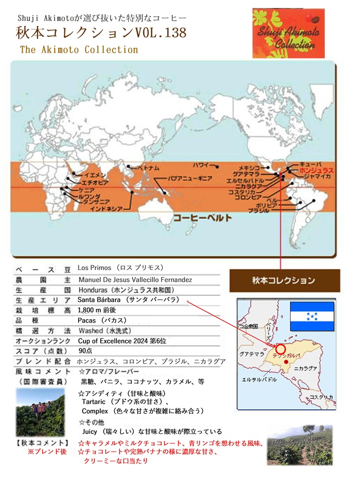 秋本コレクションはCOE(Cup of Excellence)入賞ロットや、優れたクオリティのスペシャルティコーヒーをベースに使用した、極上のブレンドコーヒーです。ファディのトップ 『Shuji Akimoto』 が厳選した最上級のコーヒーを皆様にお届けします。今回のベース豆は、中米ホンジュラスの2024年度 COEで6位に輝いた、Los Primos (ロス プリモス)です。